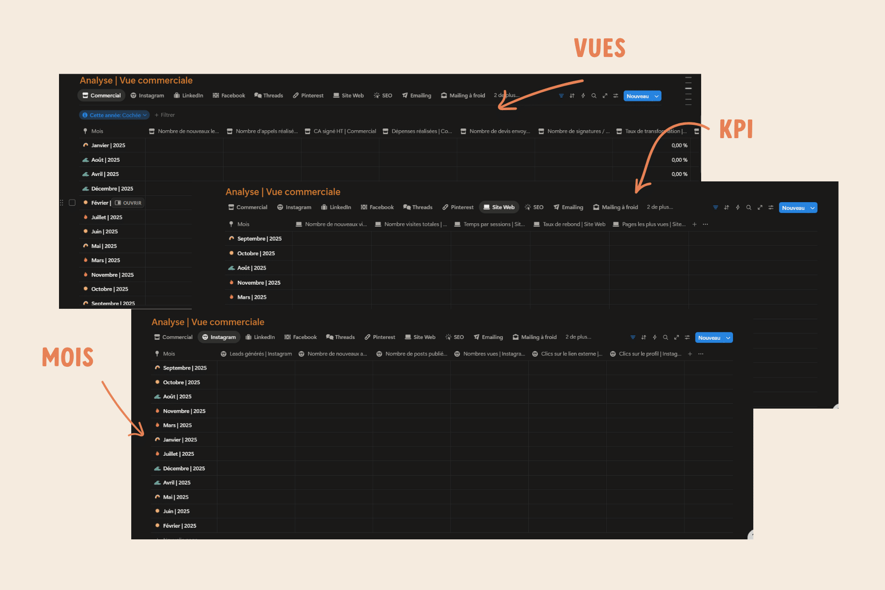 Avec ces deux informations, tu peux te créer un tableau commercial avec des vues par canal, sur Google Sheets, ou Notion par exemple. Chaque mois, tu pourras y reporter les données marketing pour pouvoir suivre leurs pertinences et t’aider dans tes choix marketing.
